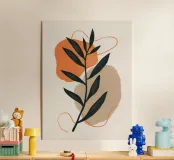 Two stylized leaves, one black and one terracotta, are depicted with elegant lines and shapes against a neutral, textured background, evoking a calm, bohemian feel.