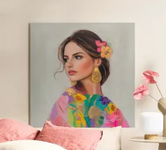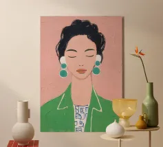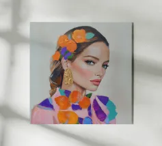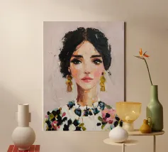Un ritratto femminile dall'animo profondo, con pennellate espressive e orecchini d'oro. Questo pezzo incarna una tranquilla sicurezza e una bellezza moderna, ispirata all'estetica di Anthropologie e al massimalismo romantico.