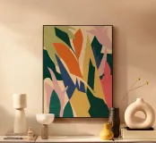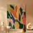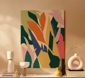 An abstract composition of overlapping leaf and plant forms. The use of bold, solid colors like green, yellow, pink, and dark blue creates a vibrant and modern botanical artwork.