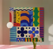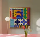 A bold and dynamic abstract composition filled with stylized flowers, geometric patterns, and organic shapes in a vibrant primary color palette. The artwork has a playful, folk art feel with a modern twist.