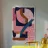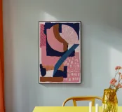 A bold and modern abstract composition features a dynamic arrangement of overlapping shapes in pink, navy blue, and black, with textured details creating a sophisticated and graphic piece.