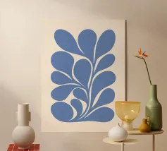 Un vivace sfondo blu fa da sfondo alle forme botaniche di questo moderno poster grafico. Le forme floreali beige fluttuano sulla tela come foglie al vento, creando contrasto e movimento visivo. L'opera d'arte fonde palette di colori mediterranei e chiarezza scandinava, offrendo un pezzo fresco ed elegante per gli amanti della natura e del minimalismo.