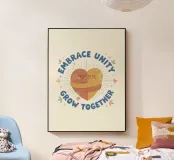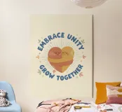 A heart-shaped figure formed by two hugging characters sits at the center of the phrase 'EMBRACE UNITY, GROW TOGETHER'. The soft peach and gold tones enhance the message of love and collective progress.