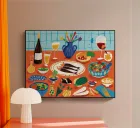 Una magnifica e abbondante selezione di tapas e antipasti è disposta su un tavolo, con pesce, olive, pane e vino, in una vivace e ricca celebrazione della cucina mediterranea.