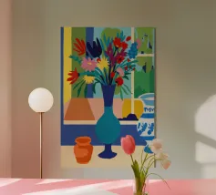 Una vibrante ed eclettica natura morta con un bouquet di fiori in due vasi con motivi diversi, uno a macchie e uno a ghirigori. La tovaglia a motivi aggiunge un mix gioioso e massimalista di colori e design.