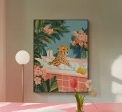 A cheeky, whimsical scene of a cheetah relaxing in a bubble bath. Fun, unexpected, and full of personality.