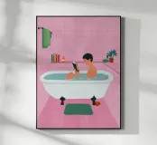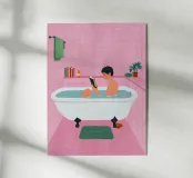 An overhead view of a person relaxing in a bubble bath, reading a book. The scene in a pink tiled bathroom is a perfect depiction of self care, tranquility, and peaceful escape.