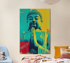 Questo sublime poster mostra una statua di Buddha in posizione di preghiera, circondata da delicati viticci dorati. La rappresentazione fotorealistica con toni caldi dell'oro e freddi dell'argento ricorda l'arte antica dei templi, combinata con una visualizzazione 3D contemporanea. Gli effetti delle intemperie e la morbida patina conferiscono all'opera una profondità spirituale. Perfetto per gli ambienti che devono emanare calma e consapevolezza. Una dichiarazione forte per chiunque apprezzi la saggezza orientale e l'atmosfera meditativa: una spiritualità senza tempo per la casa moderna.