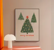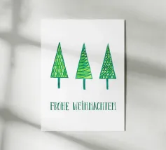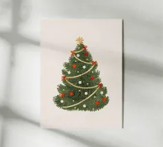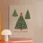 Tre alberi di pino semplicemente disegnati con decorazioni scintillanti su uno sfondo neutro.