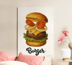 This artwork adds a playful yet timeless touch to any space. Perfect for kitchens, diners, or burger lovers, it’s a stylish way to bring vintage flair to your decor. Celebrate the classic charm of a juicy burger with this retro-style poster! Featuring a bold, minimalist design of a single, perfectly-stacked burger.
