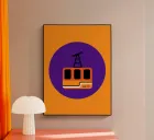 This design celebrates the aesthetics of 1970s winter sports through a minimalist illustration of a cable car cabin. Using simple geometric lines, the artwork captures the nostalgic spirit of mountain holidays. The use of bright, pop colours brings a modern energy to this vintage subject, reminiscent of classic mid-century travel posters.