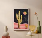 Minimalist silkscreen style illustration of a cactus in the desert, with pink and yellow pastel colours against a black background. The night sky shows a moon created with risograph gouache with soft edges in a minimalist style.