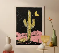 Una straordinaria illustrazione in stile linoleografico di un paesaggio desertico con cactus alti e strutturati sotto un sole radioso. Gli intricati disegni sulle piante e sul terreno creano un senso di profondità e di movimento, catturando la cruda bellezza dell'arida natura selvaggia.