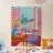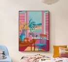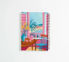 A vibrant and colorful illustration of a cafe interior, with a pink table, a blue chair, and a window looking out onto a sunny scene. The artwork is a joyful and energetic depiction of a cheerful cafe corner.