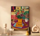 A vibrant still life featuring a cup of coffee and a beautiful bouquet of flowers on a round, patterned table. The rich colors and lively composition create a cheerful and energetic morning or afternoon scene.