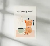 Charming, minimalist illustration featuring the words "Good Morning Coffee", an orange espresso pot and a steaming cup on a delicate background. Warm natural tones and a hand-drawn look give the motif a cosy, modern café atmosphere. Ideal for the kitchen wall, coffee corner or as a stylish gift for coffee lovers.