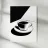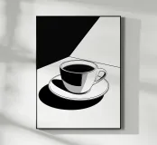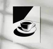 Illustrazione minimalista in bianco e nero di una tazza di caffè su un piattino, con un gioco di luci e ombre. Un design grafico e puro, ideale per un interno moderno ed elegante.