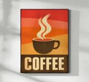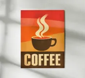 Questo poster nostalgico celebra il caffè con le immagini iconiche degli anni Settanta. Le sfumature di colore orizzontali nei toni del rosso, dell'arancione e del giallo ricordano l'estetica del viale del tramonto e le classiche insegne dei diner statunitensi. Le nuvole di vapore stilizzate e la chiara silhouette della tazza mostrano influenze dell'art déco e del design grafico di metà secolo. L'audace tipografia nella parte inferiore conferisce al pezzo un carattere sorprendente. Il perfetto equilibrio tra arte decorativa e design funzionale. Un must per gli amanti del vintage e del caffè, per le caffetterie e le cucine.