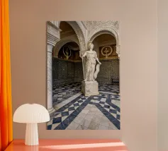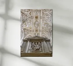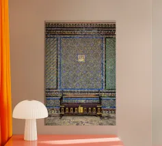 L'immagine mostra un interno storico della Casa de Pilatos di Siviglia, un palazzo del XVI secolo con influenze architettoniche mudéjar, gotiche e rinascimentali. Le pareti sono completamente ricoperte da piastrelle decorate con motivi geometrici e floreali nei toni del blu, del verde e del marrone. Queste piastrelle sono tipiche dell'arte mudéjar e riflettono la diversità culturale dell'Andalusia. Il soffitto è costituito da pannelli in legno dorato con complessi ornamenti e rilievi che documentano la maestria dell'epoca.