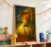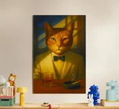 Un felino degno di un ruolo da protagonista. Casablanca Cat raffigura un sorprendente soriano arancione seduto a un tavolo poco illuminato, vestito con uno smoking color crema e un papillon nero. Davanti a lui riposa un bicchiere di whisky e un sigaro fumante in un pesante posacenere, con il fumo che si accartoccia verso l'alto in ciuffi pittorici. La luce dorata filtra da una finestra, proiettando ombre geometriche e nette che accentuano l'atmosfera noir.