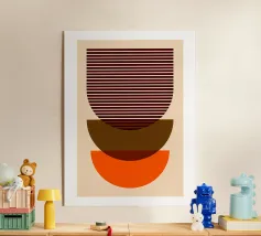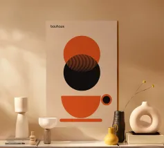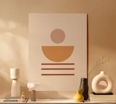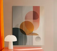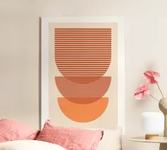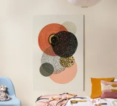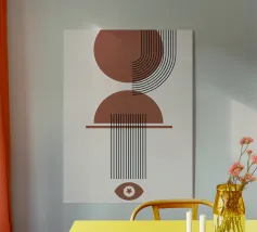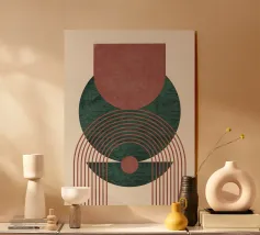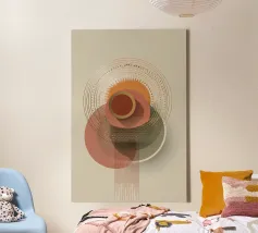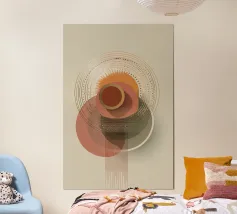 Una composizione astratta ispirata al Bauhaus, caratterizzata da cerchi concentrici sovrapposti, linee radiali e calde tonalità della terra. La geometria equilibrata e le texture raffinate evocano un senso di calma e ordine cosmico, un omaggio moderno alle aureole celesti e al design grafico vintage. Ideale per gli interni che celebrano il minimalismo, la struttura e l'eleganza senza tempo.