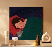 A person sleeps peacefully under a starry night sky, wrapped in a green patterned blanket with a small grey cat curled up on their chest, evoking a sense of magical, serene dreams.