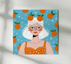 Questo pezzo ritrae una donna seduta accanto a una mezzaluna, che indossa una veste blu e argento. Lo sfondo viola intenso, ornato di stelle, evoca una serenità celestiale.