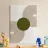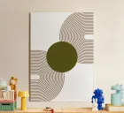A central olive green circle is flanked by two sets of symmetrical, curved, brown lines that resemble arches. The minimalist composition creates a harmonious balance between the geometric elements.