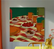 A dinner table scene with a red and white checkered tablecloth, set with bowls of food and orange cups. The perspective and colors create a cozy, communal feeling.
