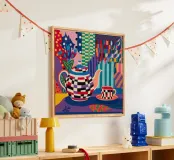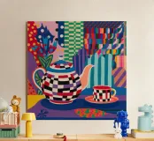 A joyful and vibrant still life of a checkered teapot and a matching cup, set against a background of colorful, blocky shapes. The artwork is a maximalist celebration of the cozy ritual of tea time.
