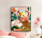Provate il perfetto mix di stile boho e relax con 'Chic Reading Corner: Ragazza boho su tappeto ghepardo". Questa stampa d'arte cattura un momento di tranquillità di una ragazza che legge in uno spazio accogliente ed eclettico.