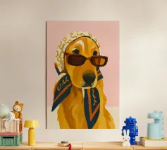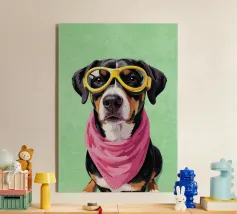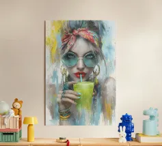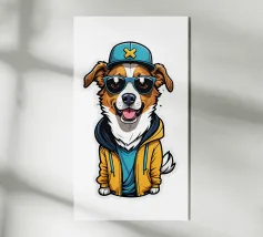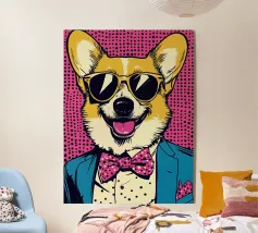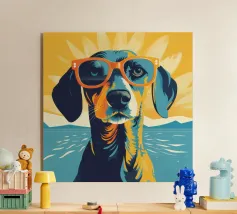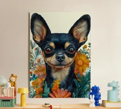 Cane Chihuahua nero e abbronzato, con sciarpa blu stile bandana, occhiali da sole rotondi, illustrazione di un buffo Chihuahua che tiene un bicchiere da cocktail con la zampa, simpatico disegno di Chihuahua per dare colore alle pareti o per decorare l'agenda. Spirito pop e contemporaneo. Per tutti gli amanti del Chihuahua.