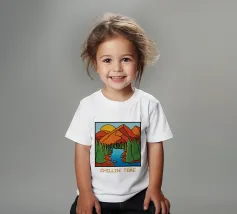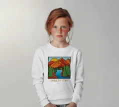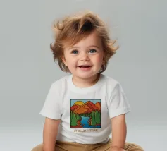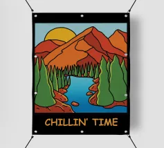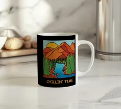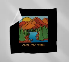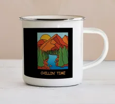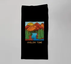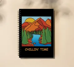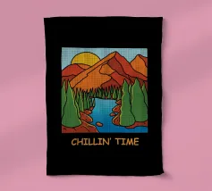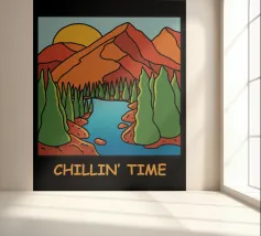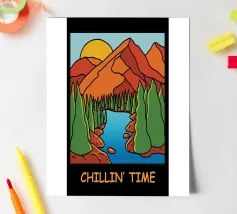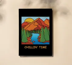 Sperimentate l'essenza della tranquillità con il nostro design Chillin Time, dove il sole bacia dolcemente le serene cime delle montagne mentre le foreste lussureggianti abbracciano il paesaggio. Illustrazione retrò con rumore e tipografia.