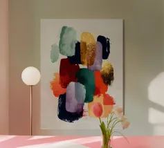 Vibranti pennellate di corallo, verde acqua e senape scorrono liberamente su uno sfondo neutro. Una composizione audace e gioiosa che celebra la spontaneità dell'arte moderna.