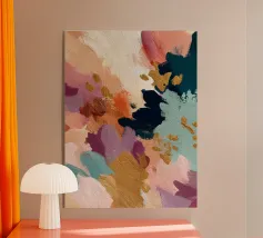 Vibranti pennellate di corallo, verde acqua e senape scorrono liberamente su uno sfondo neutro. Una composizione audace e gioiosa che celebra la spontaneità dell'arte moderna.