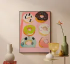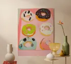 in gouache painting of six donuts in a pastel pink box, in the style of Henri Matisse, with a minimalist style, brush strokes, flat colours, pastel colours and a white background. The painting is high resolution, high quality and rich in detail, with extreme detail and cinematic lighting.
