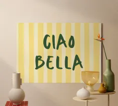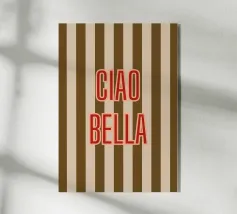 Un design vivace e giocoso intitolato "Ciao Bella", con questa frase allegra in caratteri verdi in grassetto su uno sfondo di strisce arancioni vivaci. L'energica combinazione di colori e l'audace tipografia conferiscono un'atmosfera divertente e dinamica a qualsiasi spazio, rendendolo perfetto per coloro che amano l'arte elegante e di impatto. Il vivace contrasto tra l'arancione caldo e il verde fresco crea un senso di positività e gioia, rendendo questa stampa un'ottima aggiunta a cucine, soggiorni o qualsiasi area che necessiti di un po' di stile italiano. Ideale per arte da parete, poster, abbigliamento e altro ancora!