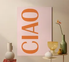 Questo vivace design presenta la parola "Ciao" in un audace carattere di ispirazione retrò con caratteri rosa acceso e un sorprendente contorno arancione.