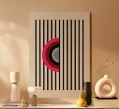 Questo poster astratto e minimalista presenta un bersaglio rosa circondato da linee verticali nere. Questo design moderno e contemporaneo sarà perfetto per il vostro salotto.