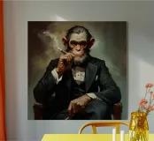 Uno scimpanzé carismatico vestito con un classico smoking nero, seduto con sicurezza su una poltrona mentre fuma un sigaro. L'immagine combina umorismo, surrealismo ed eleganza con uno sfondo atmosferico fumoso.