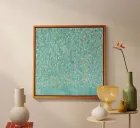 This image depicts an abstract painting characterized by a multitude of short, vertical brushstrokes in a variety of colors set against a soft blue background. The strokes create a textured and rhythmic surface that gives the impression of gentle movement or perhaps falling rain. There is a sense of depth created by the layering of paint, with hints of warmer tones peeking through cooler ones. The overall effect is calming and reminiscent of nature's elements, evoking feelings similar to watching light reflections on water or leaves rustling in the breeze.