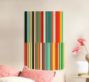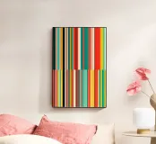 Vibrante op art a strisce luminose di codici a barre: Questa potente composizione astratta celebra la pura energia del colore. Le bande verticali di rosso, turchese, giallo, arancio e verde scuro ricordano gli esperimenti ottici di Bridget Riley. Lo sfalsamento ritmico al centro dell'immagine crea tensione visiva e movimento. L'esecuzione precisa e la palette di colori retrò evocano l'estetica del design degli anni Sessanta. Un gioco ipnotico con la percezione e il ritmo: un'astrazione contemporanea di grande impatto visivo. Perfetto per gli amanti dell'arte geometrica e delle composizioni cromatiche potenti.
