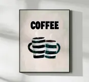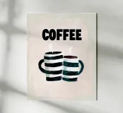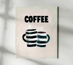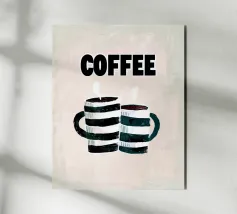 This playful contemporary illustration pairs bold retro typography with hand-painted textures to celebrate the simple joy of coffee. Two striped mugs release gentle steam beneath the strong, graphic word “COFFEE,” creating a warm, friendly composition. The soft neutral background and expressive brushstrokes balance modern poster design with a nostalgic, handmade feel. Ideal for kitchens, cafés, coffee corners, or cozy interior spaces, this artwork turns an everyday ritual into a cheerful visual statement.