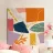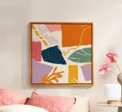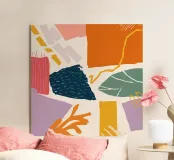 Un collage astratto di forme frantumate e sovrapposte in una vibrante tavolozza di arancione, blu e rosa crea una composizione dinamica, energica e moderna.
