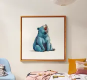 A blue bear in a comic style. The bear is yawning and looks tired or as if he has just woken up.