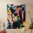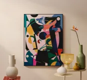 This artwork features an abstract composition with a mix of geometric shapes and vibrant colors such as pink, yellow, green, and black. The shapes are layered and create a sense of complexity.