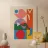 Una composizione con forme geometriche audaci e colori vivaci forma un mosaico astratto. Elementi come cerchi, triangoli e una balena blu creano un intrigante equilibrio visivo all'interno del layout rettangolare.