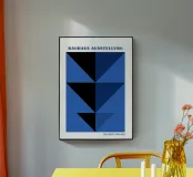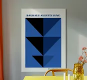 Un'astrazione geometrica potente e minimalista che cattura perfettamente lo spirito del movimento Bauhaus (1919-1923). La composizione è costruita da semplici triangoli e quadrilateri che si intersecano, utilizzando una tavolozza di colori ad alto contrasto: un vibrante blu cobalto, un audace nero e un bianco puro. Il gioco delle forme e delle sfumature di blu crea un senso di profondità e di movimento dinamico, trasformando la geometria fondamentale in un'arte moderna e convincente. Questo classico stile Bauhaus enfatizza forma e funzione, rendendolo un elegante punto focale per qualsiasi interno contemporaneo, di metà secolo o industriale.