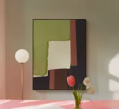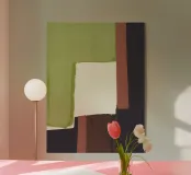 L'immagine presenta forme rettangolari sovrapposte nei toni terrosi del verde, del beige, del marrone e del nero. La composizione è minimalista ed evoca un senso di equilibrio.