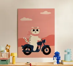 A stylish, confident anthropomorphic cat, donning a silk scarf and a leather jacket, rides a sleek scooter with a cool attitude. The vibrant and colorful image evokes a sense of adventure and charisma, blending elements of fashion, fun, and freedom. This artwork captures the essence of a modern, trendy lifestyle with a playful and confident touch.
